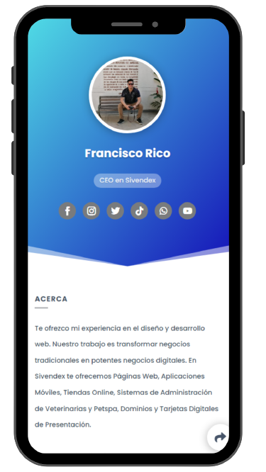 La tarjeta digital cuenta con un diseño agradable y elegante. Puedes agregar información breve de tu empresa e imagen de perfil. Enlaces a redes sociales y páginas web. Además, cuenta con botones inteligentes con ruta a WhatsApp, geolocalización de su oficina o negocio y un código QR.